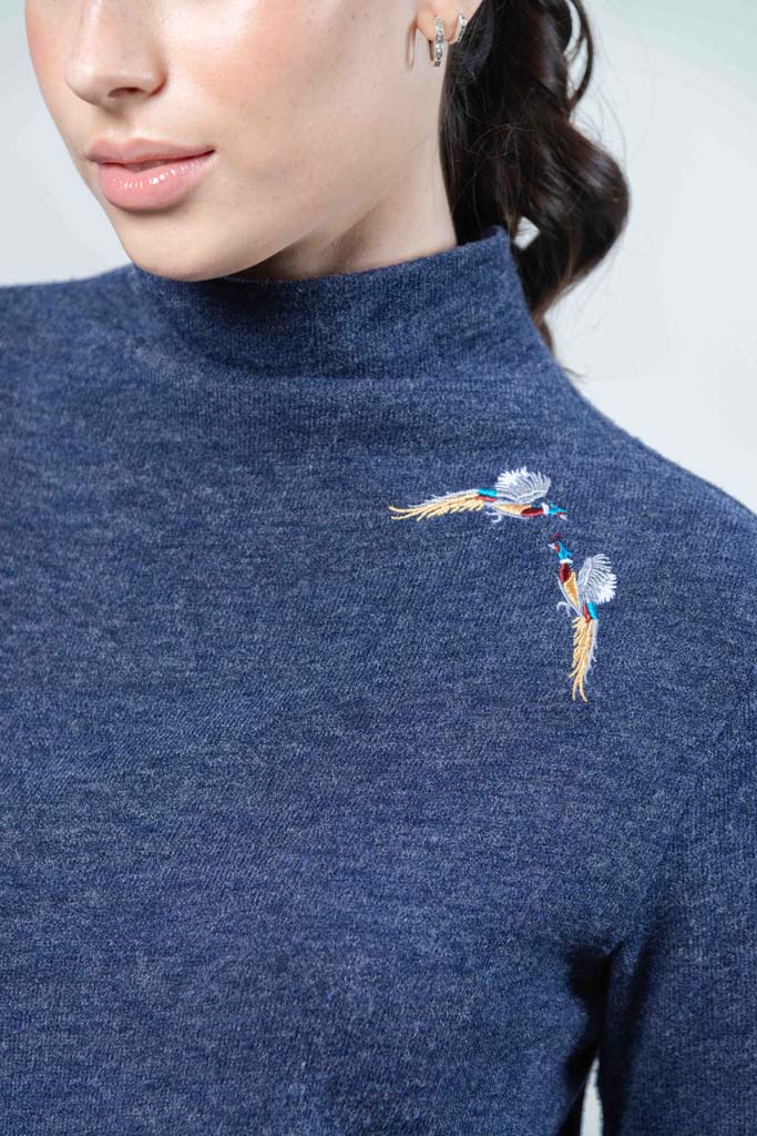 Our new knitwear top is decorated with stunning embroidered pheasants.