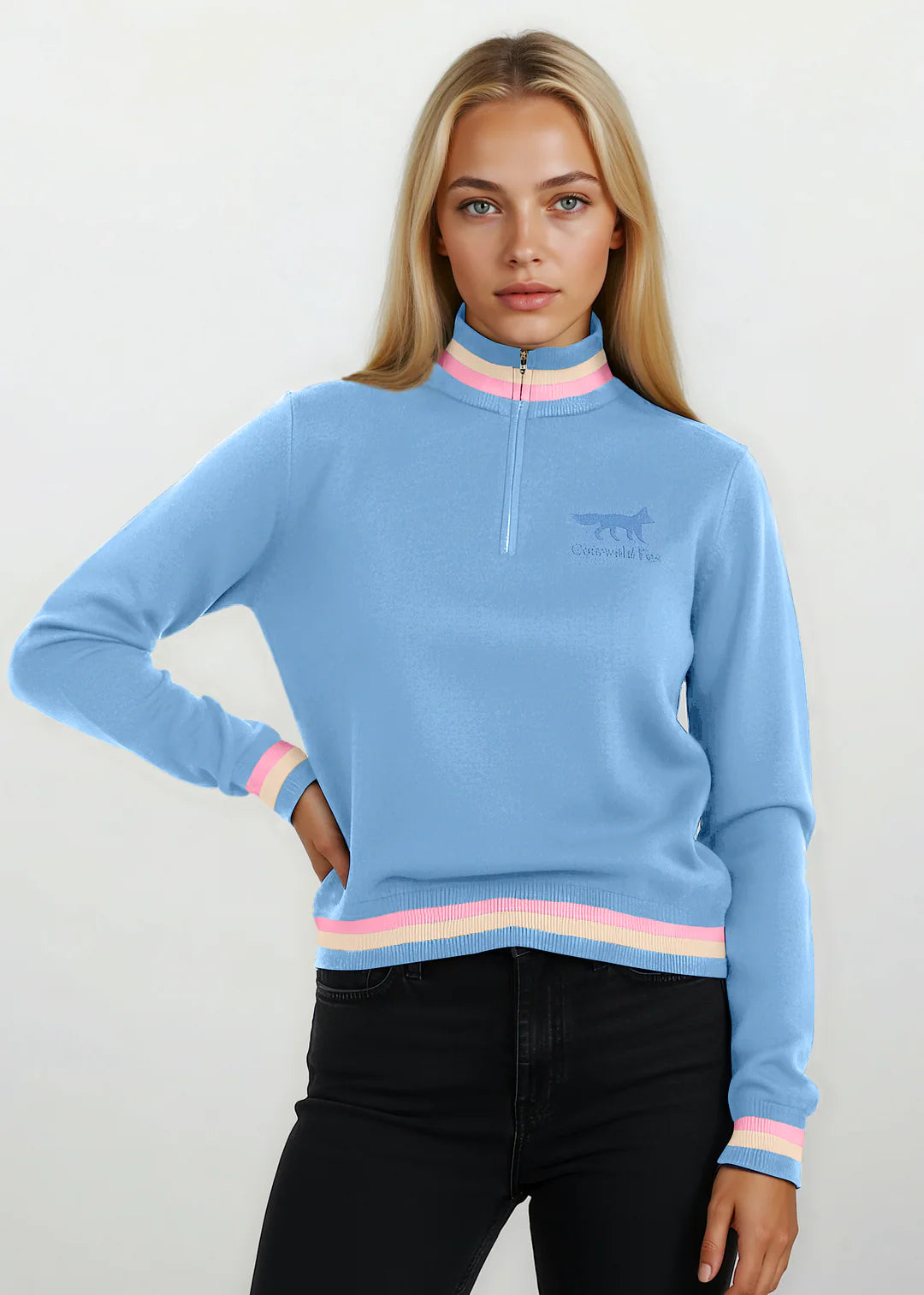 Cotswold Fox Knitted Unisex Quarter Zip - Blue with Pink and Cream