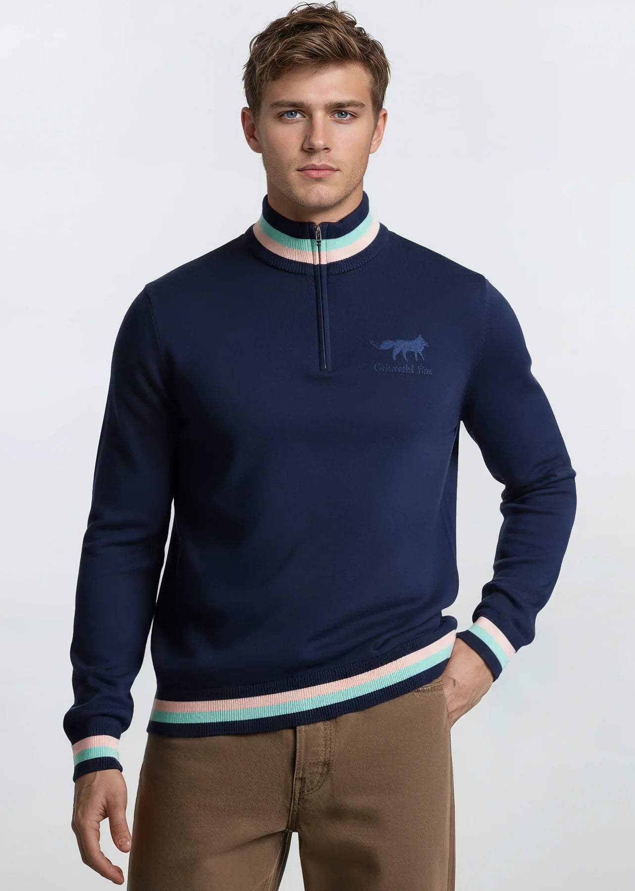 Cotswold Fox Knitted Unisex Quarter Zip - Navy with Mint and Pink