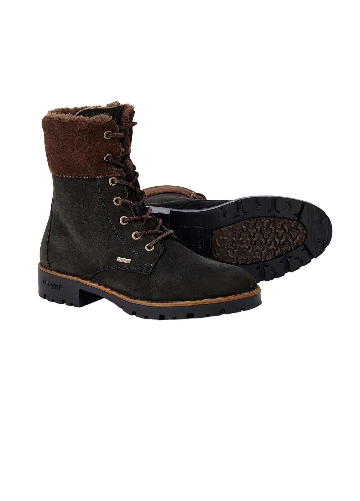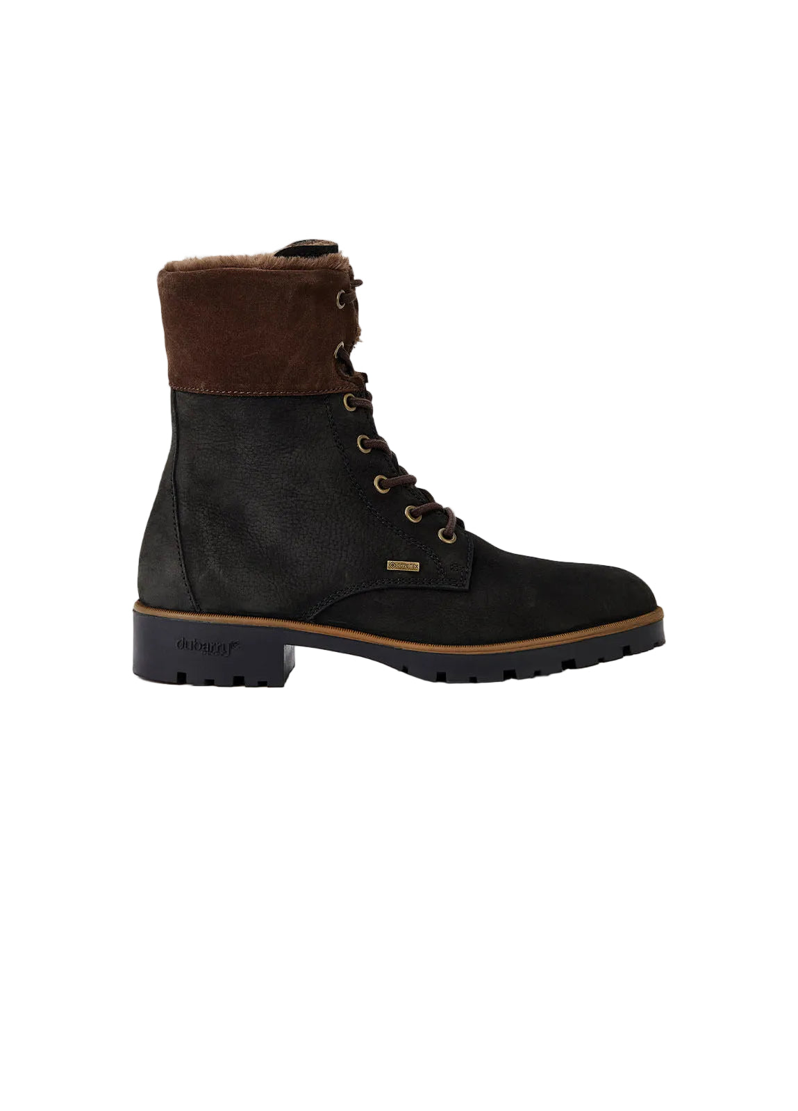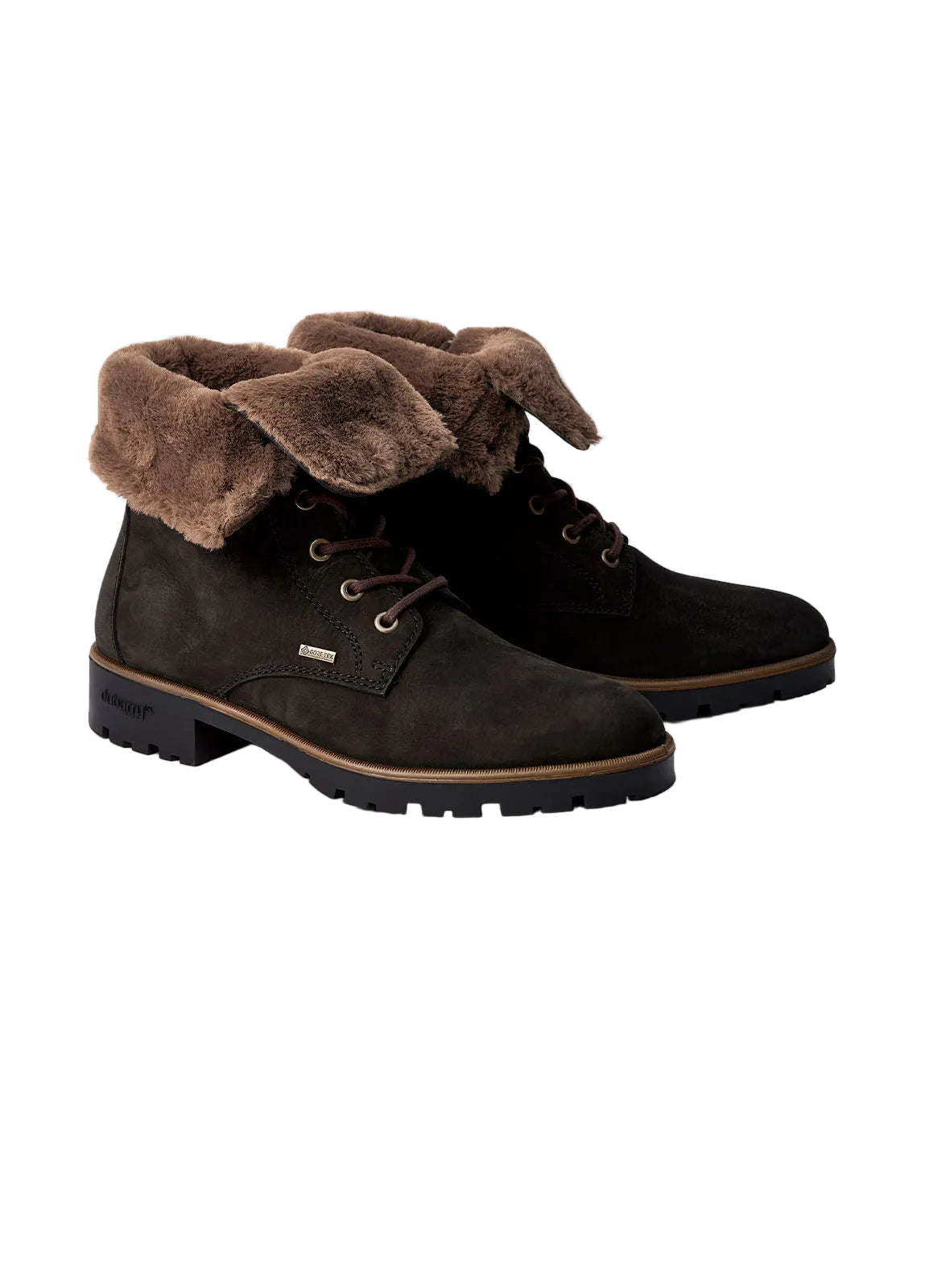A perfect combination of cosy and rugged, these fold down ankle boots have a biker boot feel but are lined with snuggly faux fur. Packed with weather resistant technology, from Dubarry's DryFast-DrysoftTM leather and GORE-TEX lining to shock absorbing, gripping soles, they are ideal weekend style with an edge - a great partner to Dubarry leather and wax winter jackets