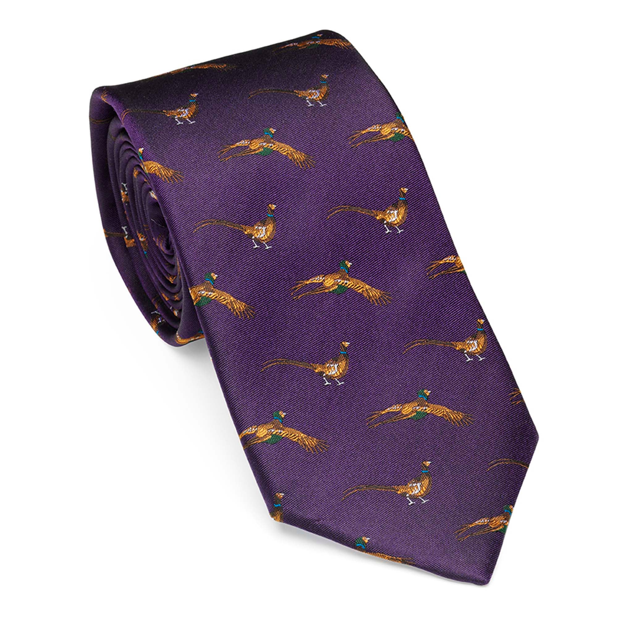 Elegant silk tie with motif of both a flying and standing pheasant, in beautiful color combinations. Made of 100% silk. Designed specifically for shooting events, but also intended for everyday use and formal occasions.