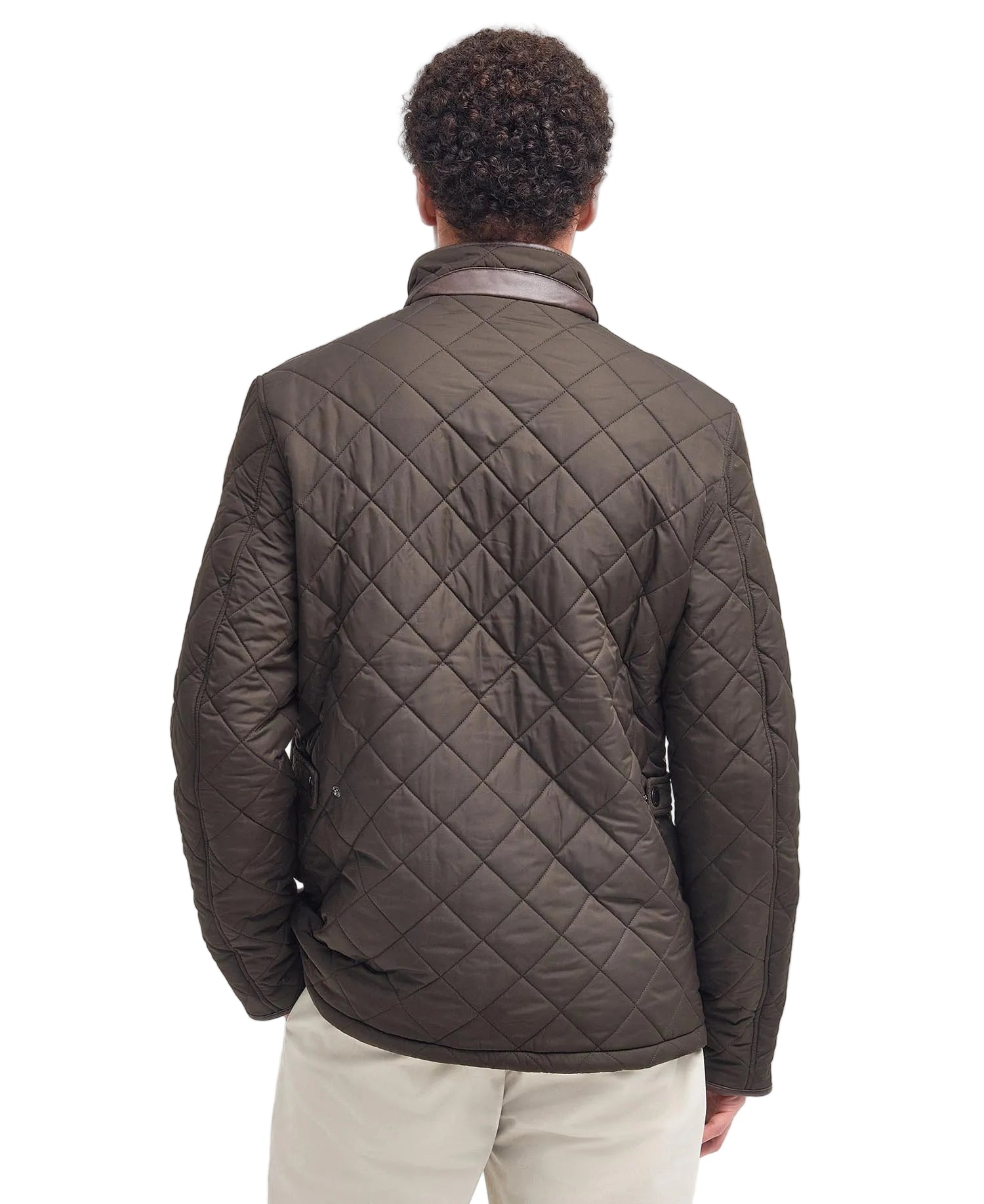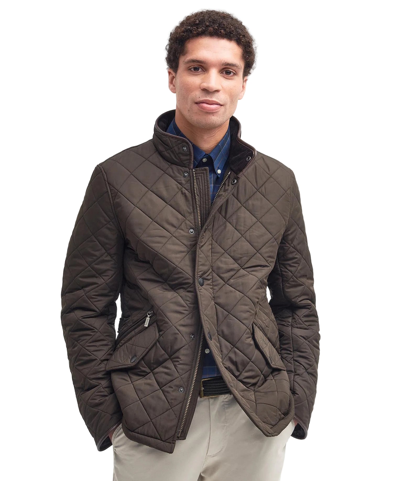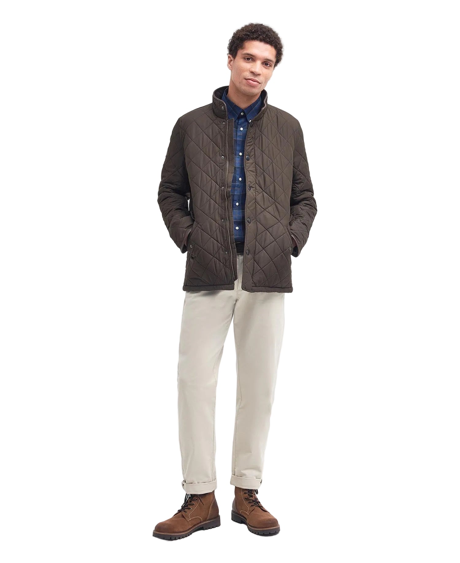 Built for the outdoors but without compromising on style, the Powell is a quilted Chelsea-style jacket that proves a firm favourite year after year. This timeless and practical fleece-lined jacket offers reliable warmth, thanks to the iconic quilted outer with 50g wadding and a super-insulating fleece lining. The two-way zip with Barbour branded ring puller fastens through to a corduroy-lined funnel neck, which can be closed with the robust stud fastenings for extra protection from wind and rain. A slimmer, contemporary shape gives a fashionable look, with back waist tabs for an adjustable fit that's ideal for essential winter layering. Two practical front pockets offer plenty of room to carry essentials, with an additional zipped pocket to safeguard valuables, a stylish synthetic leather trim finishes the collar and cuffs, and tonal Barbour embroidery trims the pocket flap.