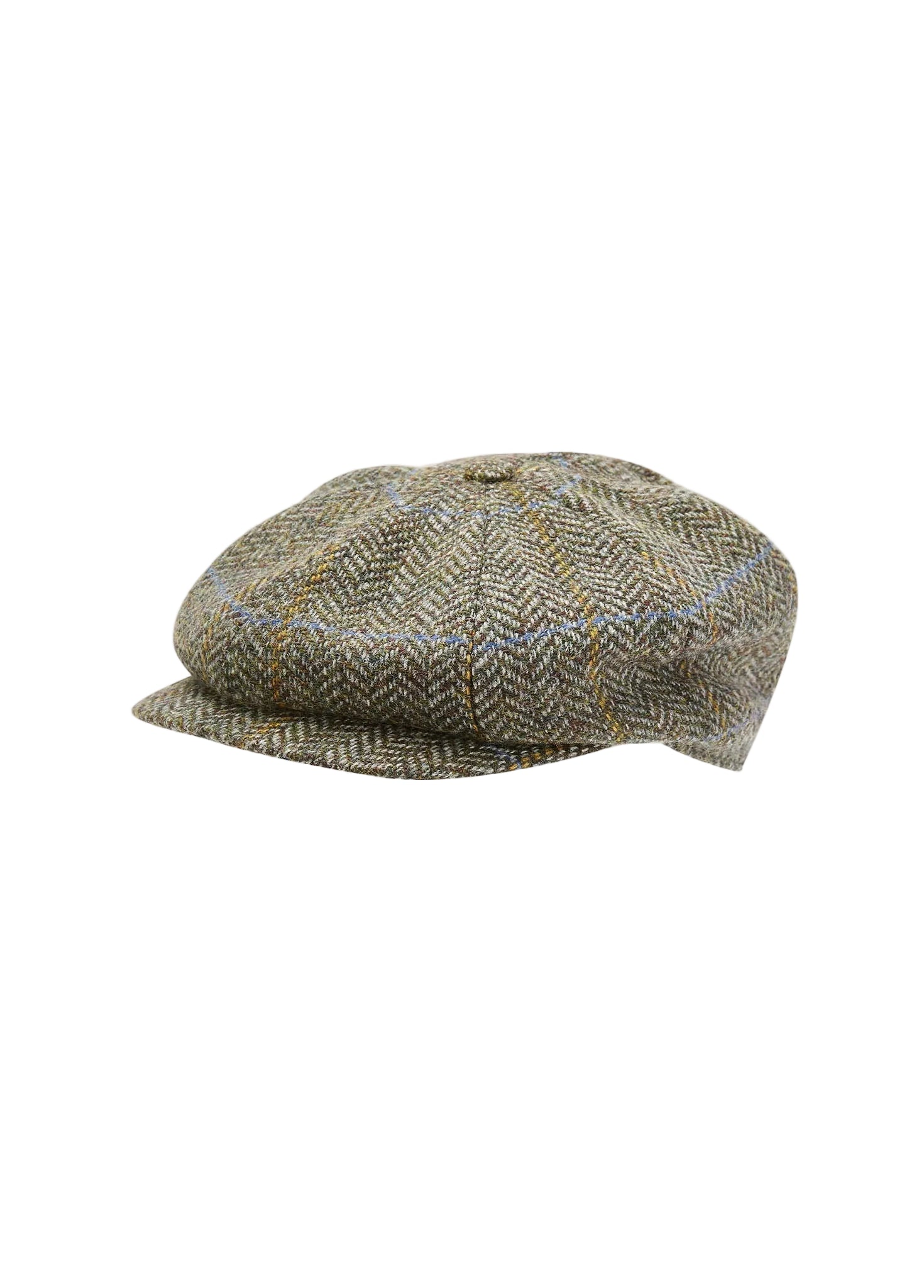 Tweed flat cap with traditional peak, for men and women. Available in a wide range of tweeds.
