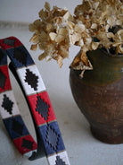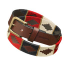 The rich red, cream, navy and golden threading makes for a perfect unisex belt, which goes well with everything from a casual suit to around the waist of a long woollen cardigan for the ladies.