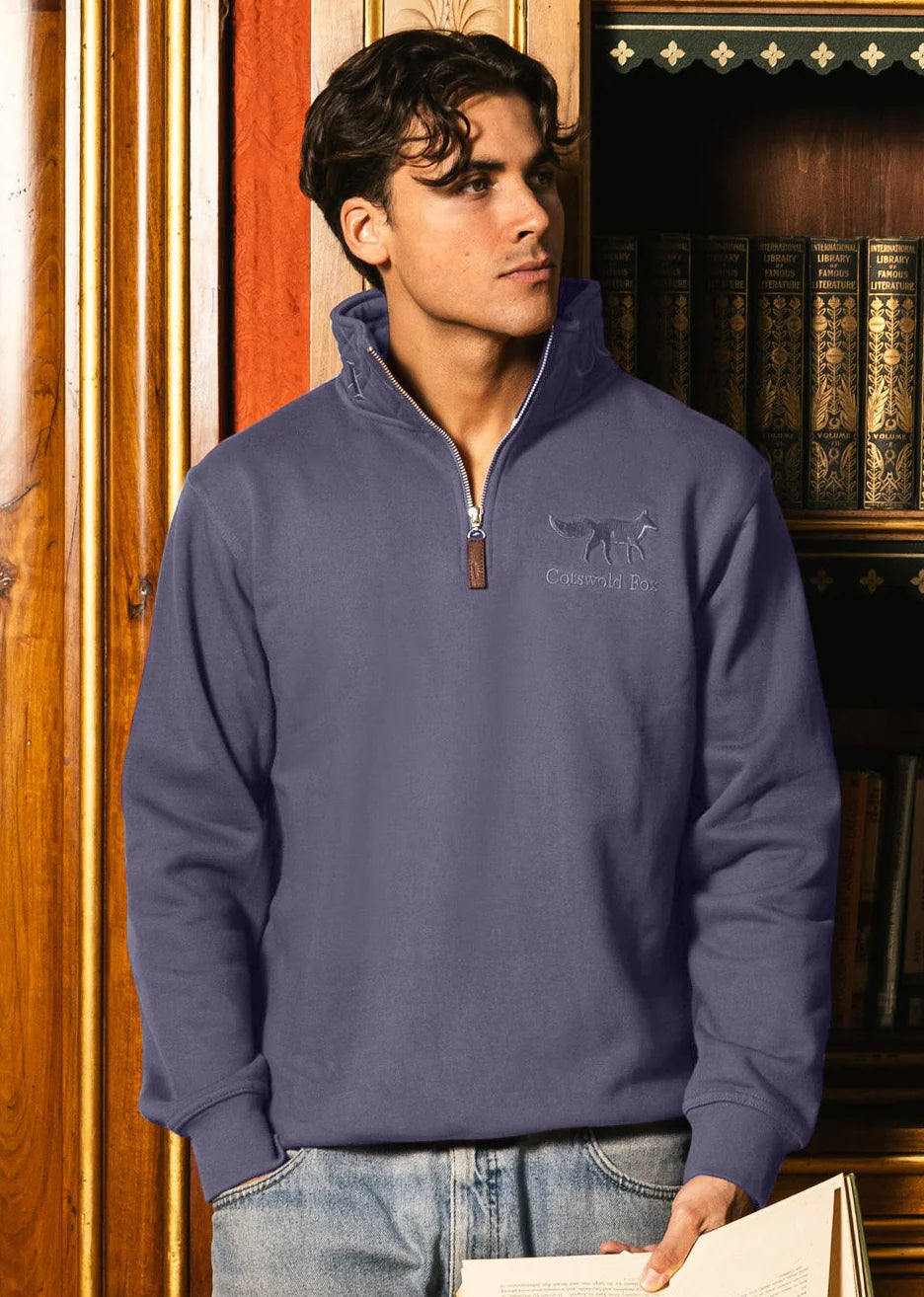 Our premium heavyweight unisex navy quarter zip jumper features our signature distinctive Cotswold Fox embroidery. Crafted for men and women, from organic cotton for all-day comfort and warmth, a zip funnel neck and soft ribbed hems and cuffs. This super comfortable layer is a must have, fun addition to your wardrobe!