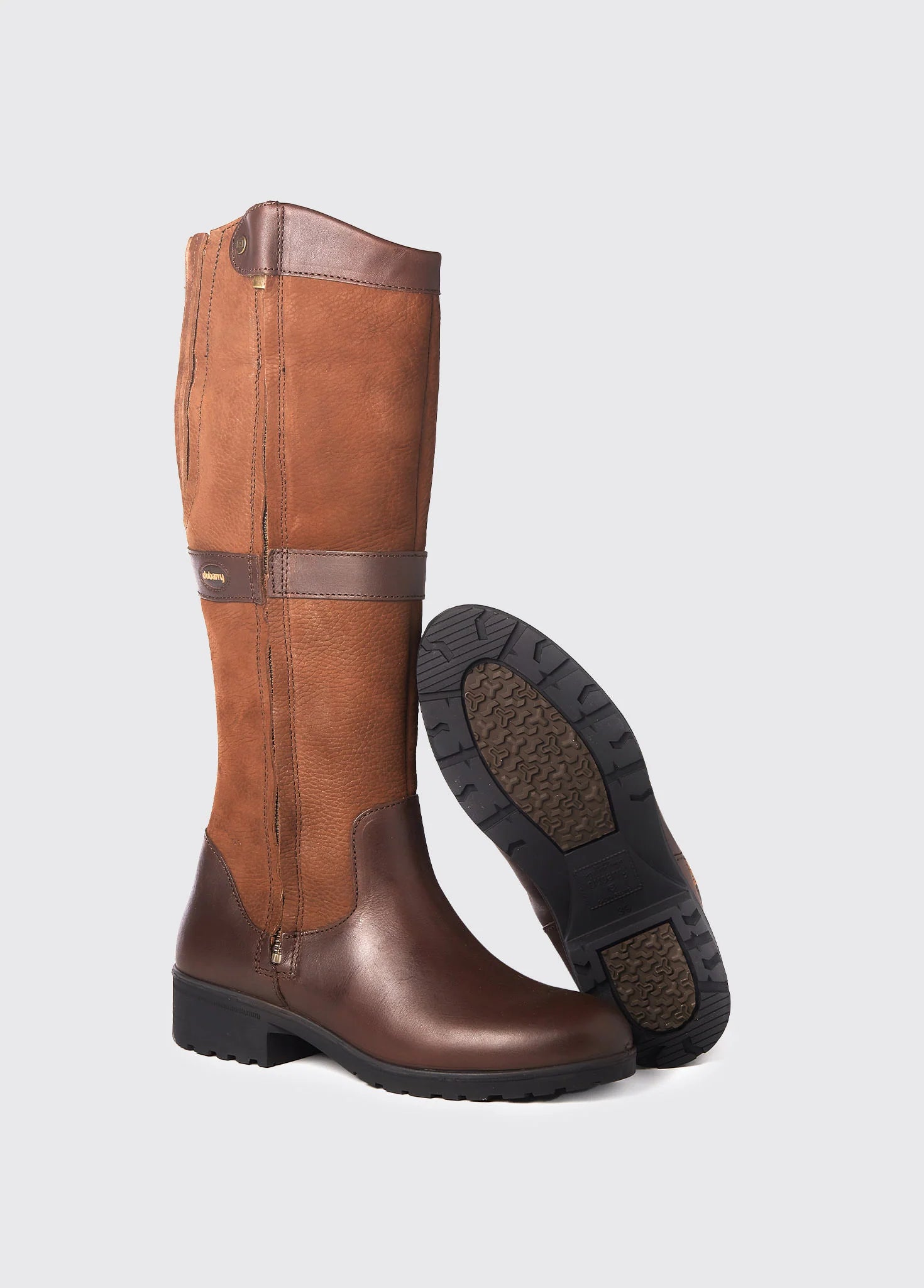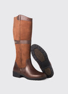 The Sligo knee-high boot for women is packed with all the technical features you'd expect from a Dubarry country boot. GORE-TEX lining and Dubarry's signature DryFast-DrySoft™ leather plus a securely bonded sole all creates a waterproof, shock-absorbing, comfortable boot. A full length zip helps foot entry and a leather covered elasticated calf panel streamlines the calf giving an elegant silhouette. Built to withstand the rough and tumble of country life, the Sligo style and fit looks great in a more urban setting too.