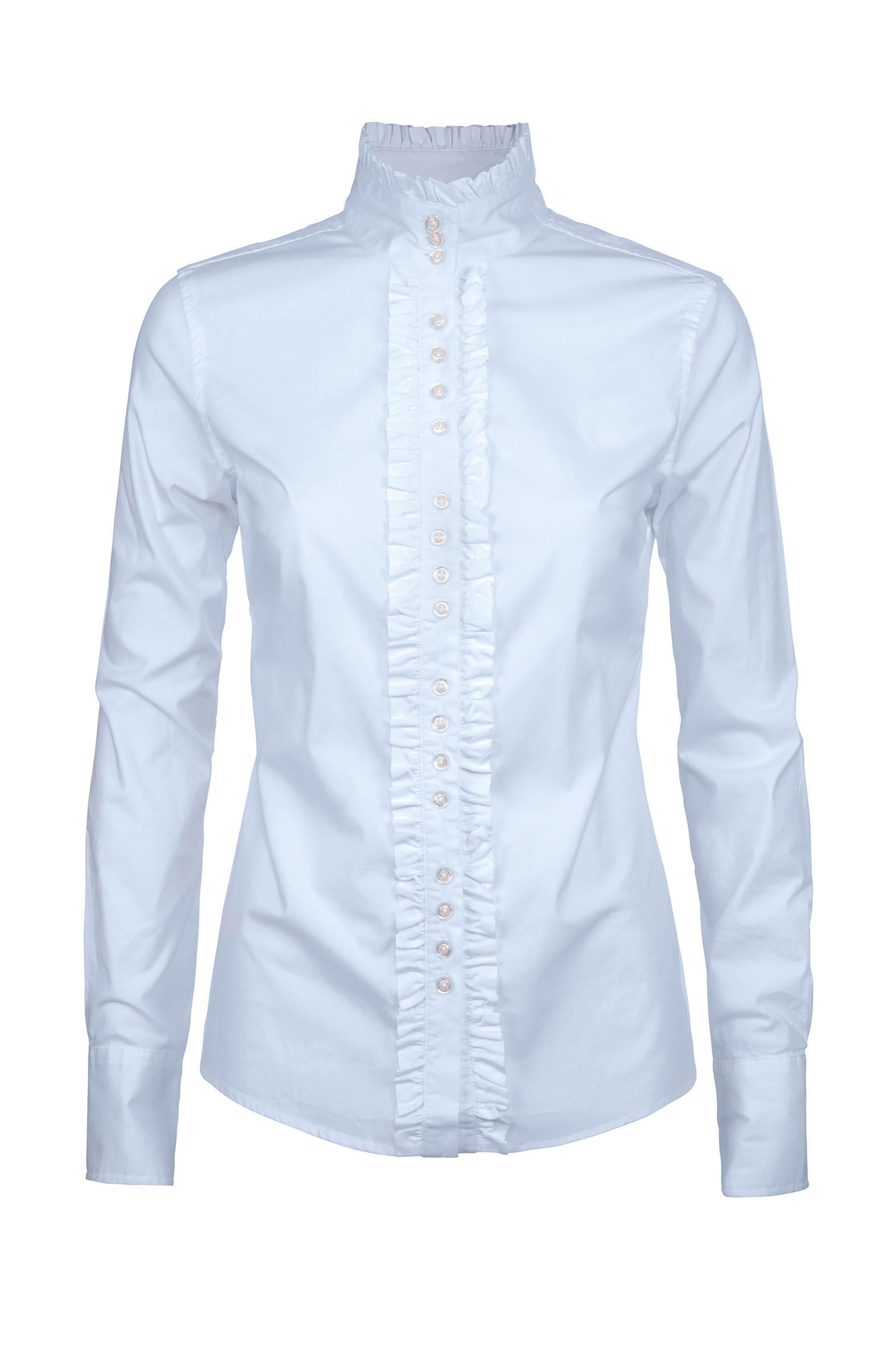 A traditionally inspired shirt, the Chamomile has an elegant style. Ruffle detail along the button fastening runs the full length up to and around the edge of the stand up collar. Team it with Dubarry tweed for a timeless country style or match with skinny jeans, Chelsea boots and a leather jacket for a modern twist.