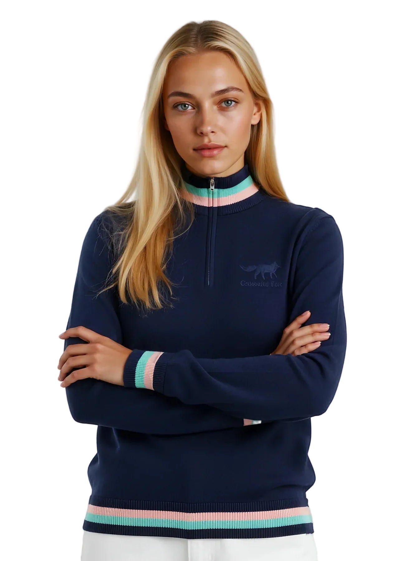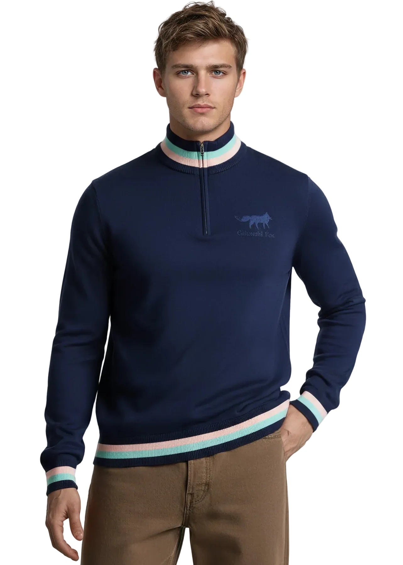Cotswold Fox Knitted Unisex Quarter Zip - Navy with Mint and Pink