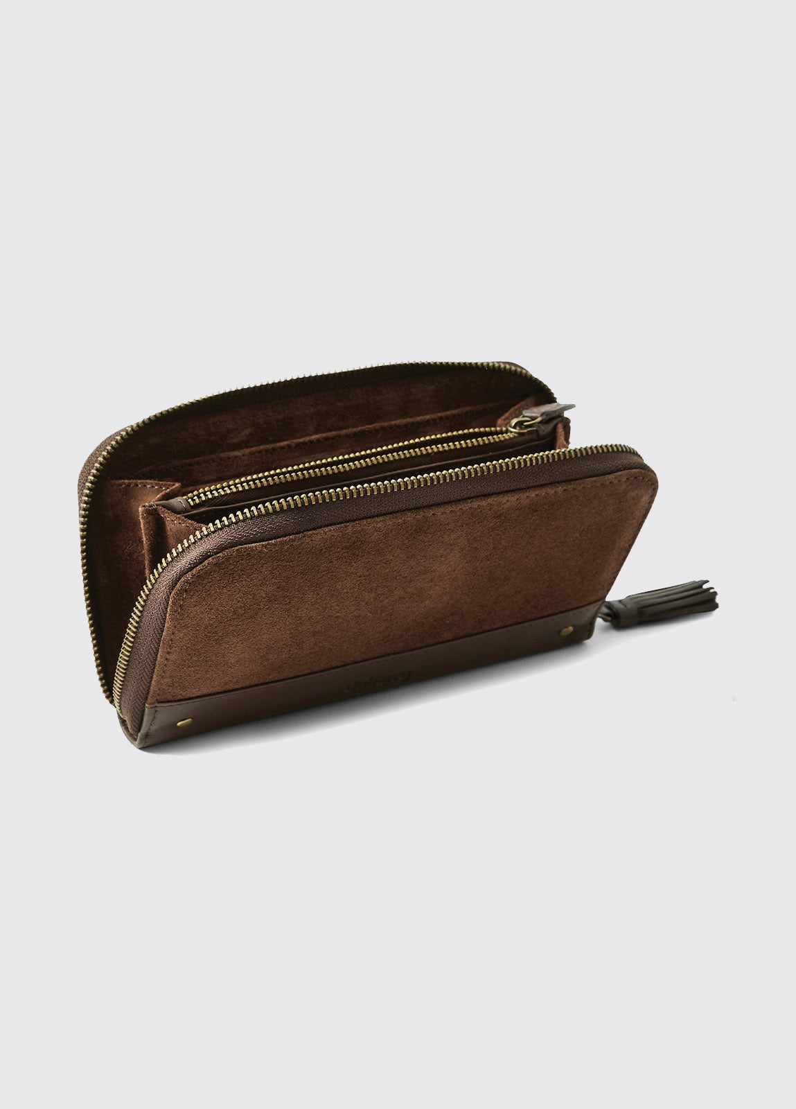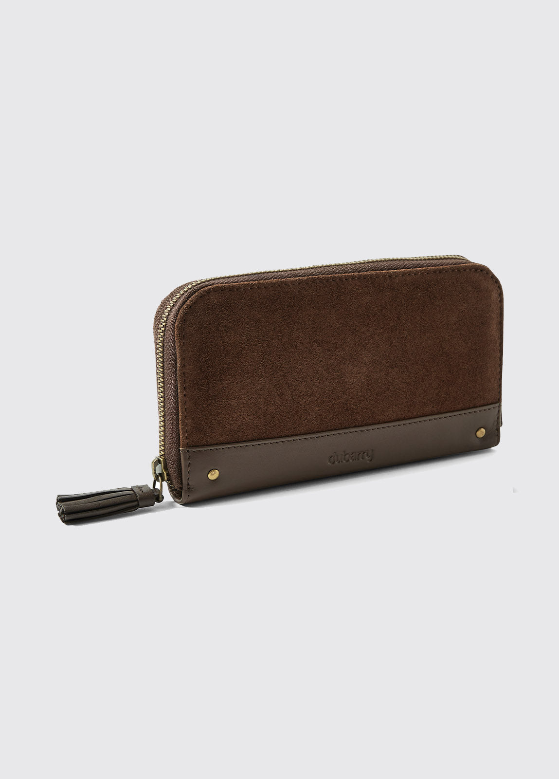 Made in superb quality suede and leather-trimmed, the Northbrook is a sleek purse, that compliments the Dubarry handbag and clothing range. RFID lined for security, it has a zipped coin pocket, note sleeve and credit card slots. A smart wallet to treat yourself to or great for a gift.