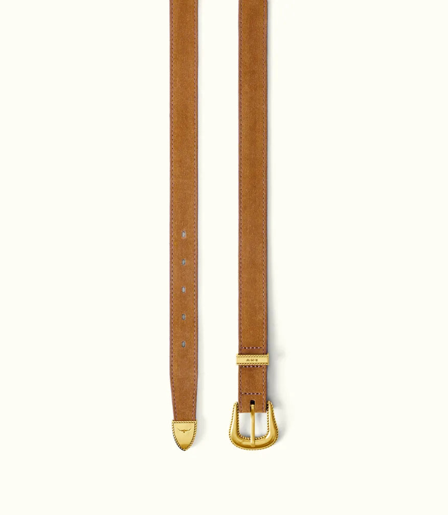 This western-inspired belt is cut from Italian suede and finished with intricate leather detailing, including a feature metal tip, complete with the iconic longhorn.