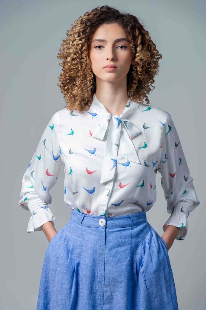 A white blouse with colourful pheasants.