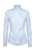 A traditionally inspired shirt, the Chamomile has an elegant style. Ruffle detail along the button fastening runs the full length up to and around the edge of the stand up collar. Team it with Dubarry tweed for a timeless country style or match with skinny jeans, Chelsea boots and a leather jacket for a modern twist.