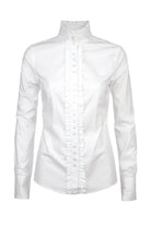 A traditionally inspired shirt, the Chamomile has an elegant style. Ruffle detail along the button fastening runs the full length up to and around the edge of the stand up collar. Team it with Dubarry tweed for a timeless country style or match with skinny jeans, Chelsea boots and a leather jacket for a modern twist.