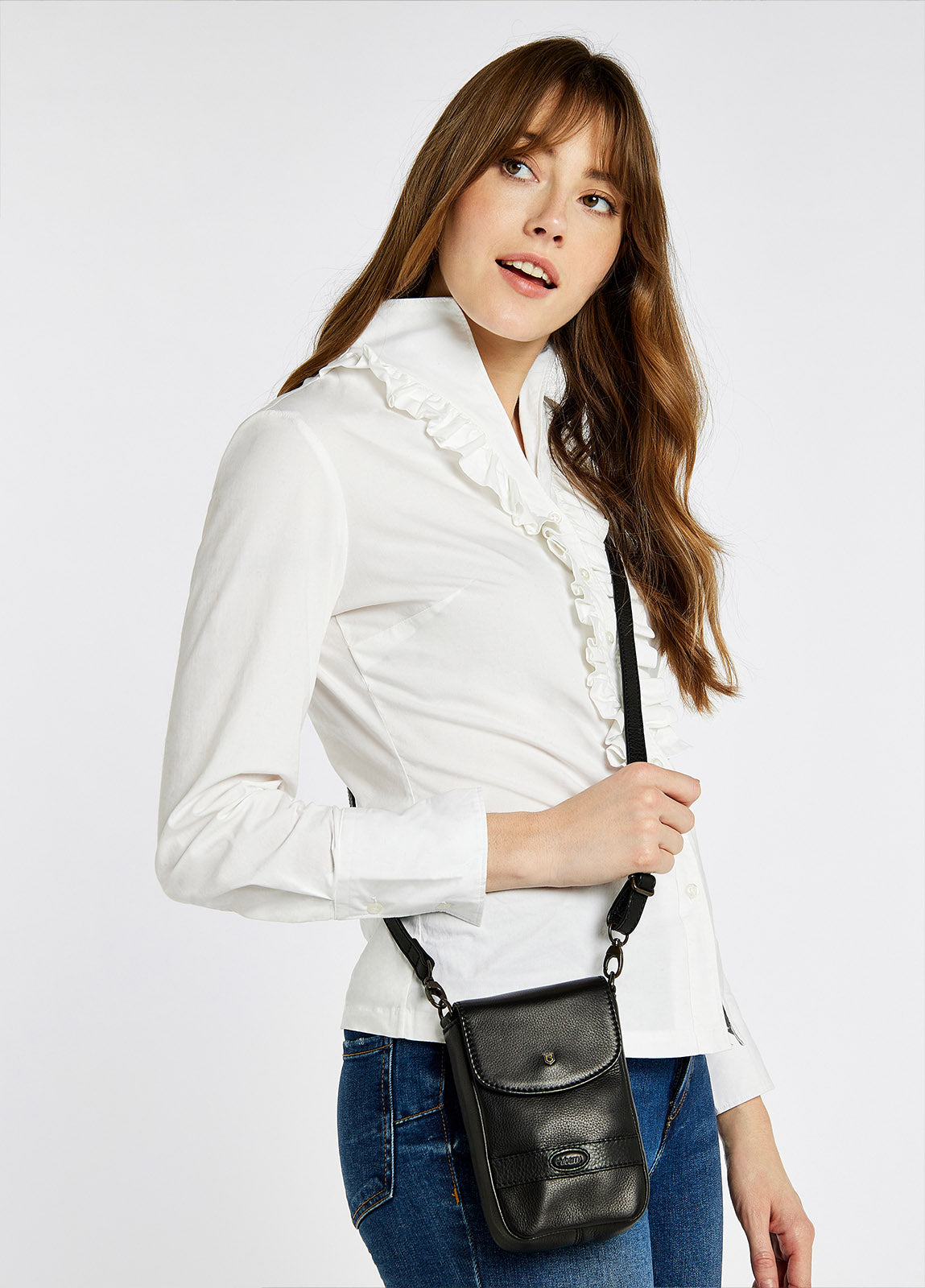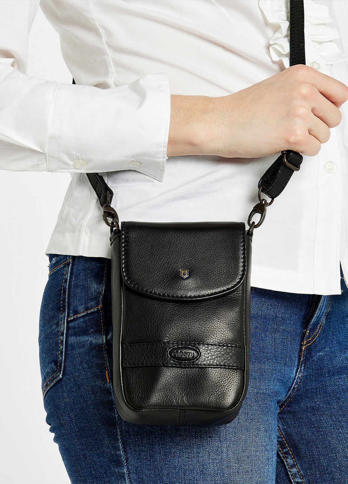 - Adjustable leather cross body strap for hands free wear
